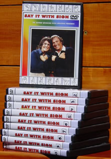For the past twenty years, Larry and Sharon Solow have been teaching Sign Language to children and adults of all ages, and take great care to explain how to use Sign Language, continually signing everything they say, using each taught sign in several sentences. Sign Language is now believed to be the third most popular language in the United States (after English and Spanish) and is used by everyone from athletes to stock traders, as well as being taught to and accepted as a second language in a growing number of colleges. There are forty half-hour lessons in the SAY IT WITH SIGN series, each containing a series of new Signs, several Fingerspelling exercises, and some sample dialogue given to teach conversational phrasing. Every 5th lesson is a review of the preceding 4 lessons. This is the most comprehensive set of 40 lessons available. |